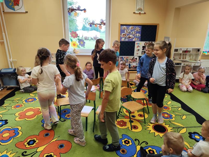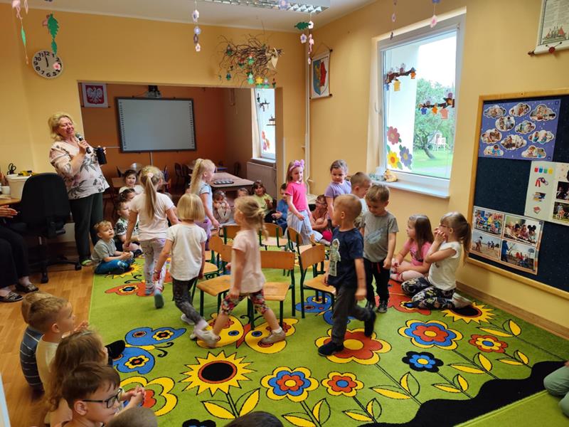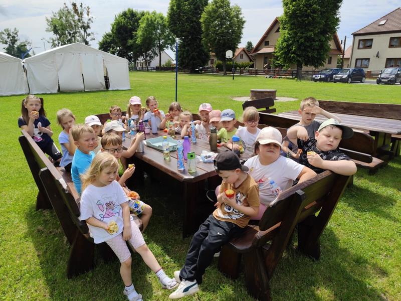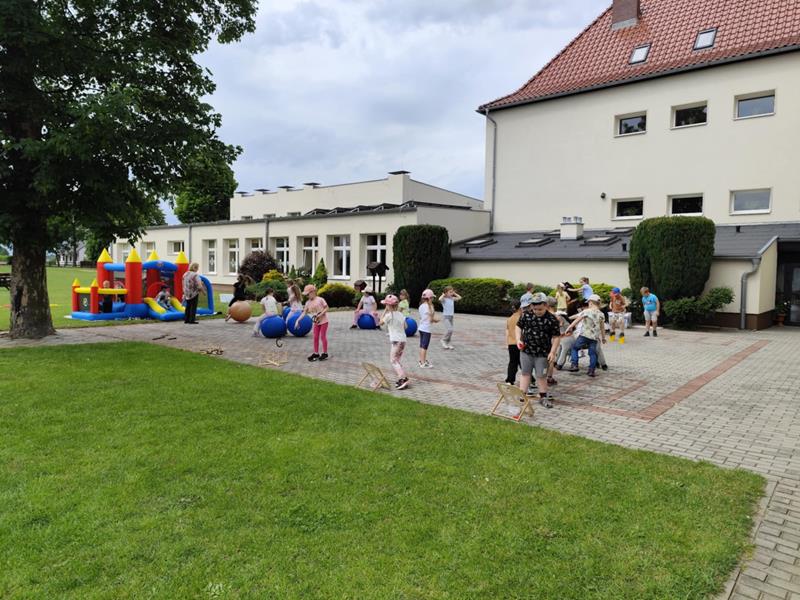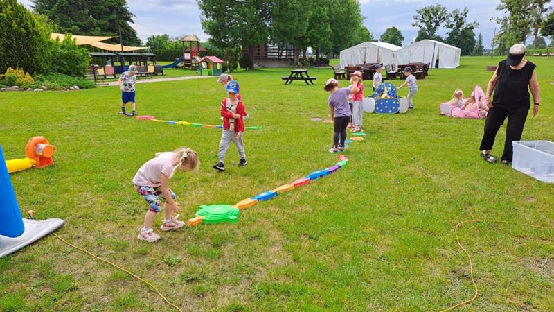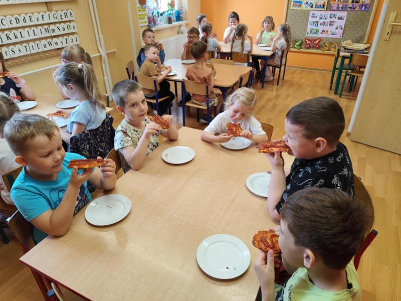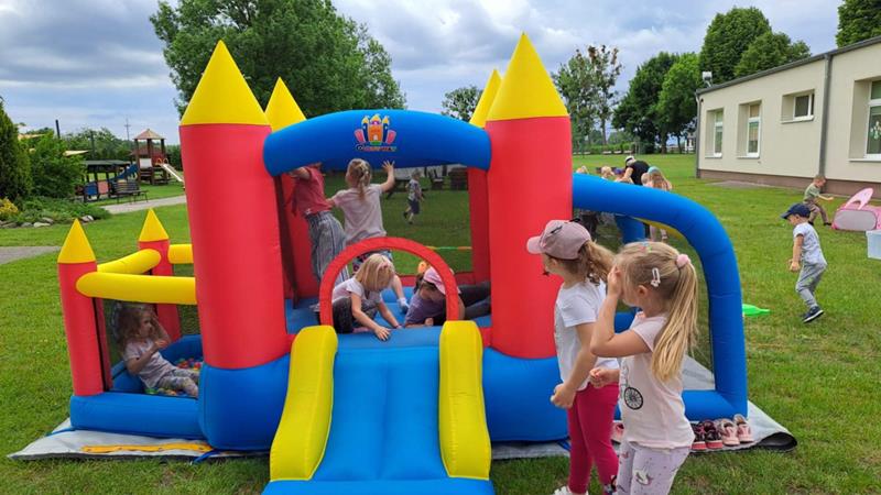 Po śniadaniu rozpoczęły się zaplanowane atrakcje. Wspólnie wykonaliśmy pyszną pizzę, którą ze smakiem później zajadaliśmy. Przedszkolaki wzięły udział w wesołych grach i zabawach ruchowych na świeżym powietrzu. Był dmuchaniec, namioty z kulkami, piłki do skakania, hulajnogi, stacje do celnego rzucania. Następnie w sali przedszkolnej udało się przeprowadzić kilka zabaw konkursowych, do których dzieci zgłaszały się z wielkim zaangażowaniem.