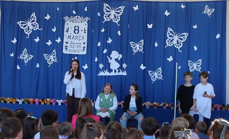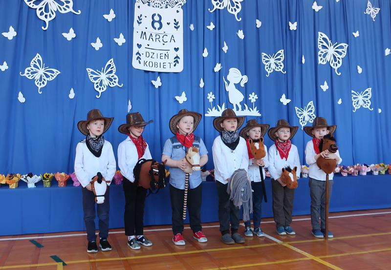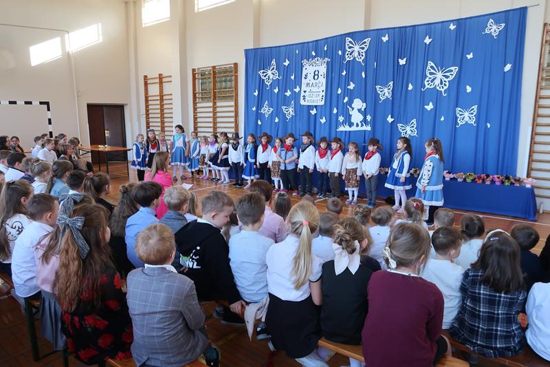 Starszaki z kowbojskim przytupem zadbały o energię na scenie. Czwartoklasiści z przymrużeniem oka zaprezentowali „Kosmiczną randkę w ciemno”. Dopełnieniem programu był śpiew i taniec. Ruch, rytm, melodia i uśmiechy na twarzach występujących sprawiły, że występy były nie tylko miłe dla oka, ale także wprowadziły wszystkich w radosny nastrój. Nie zabrakło życzeń i serdeczności skierowanych do wszystkich Pań i Dziewczynek, chłopcy pamiętali również o drobnych upominkach. Uczniowie w ciepłych słowach wyrazili wdzięczność, szacunek oraz sympatię, podkreślając rolę kobiet w życiu szkolnym i codziennym. Po apelu na uczestników czekał słodki poczęstunek, który był miłym dopełnieniem tego wyjątkowego dnia.