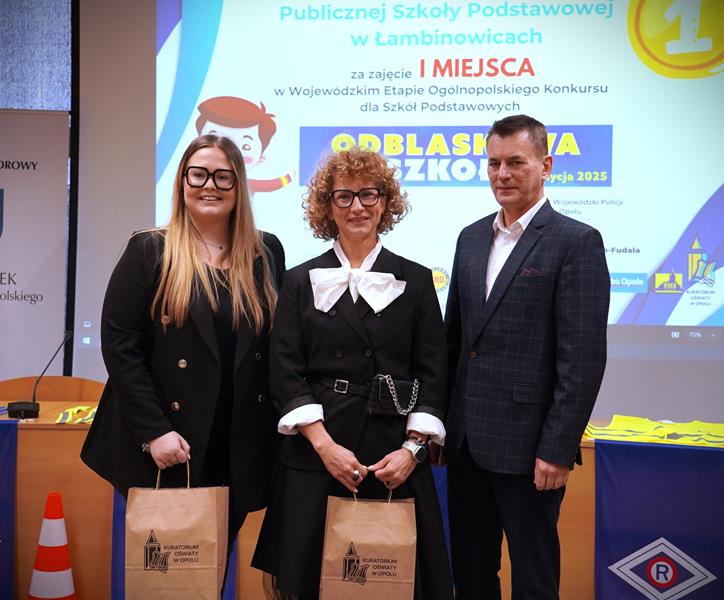 Uroczysta Gala Laureatów konkursu „Odblaskowa Szkoła” odbyła się 28.01.2026 r. w Sali Orła Białego Urzędu Marszałkowskiego w Opolu. Naszą szkołę reprezentowali pani Dyrektor Anna Meryk, opiekunowie konkursu: pani Magdalena Przeniczna, pani Zuzanna Górska oraz pani Joanna Meryk, a także delegacja uczniów, w skład której weszły dzieci i młodzież nagrywające piosenkę i film oraz przedstawiciele Samorządu Uczniowskiego. Z dumą i radością odebraliśmy nagrodę za II miejsce w Województwie Opolskim. Panie Magdalena Przeniczna i Zuzanna Górska otrzymały również nagrodę specjalną za album, w którym przedstawiły sprawozdanie z naszych działań. Gratulujemy!
