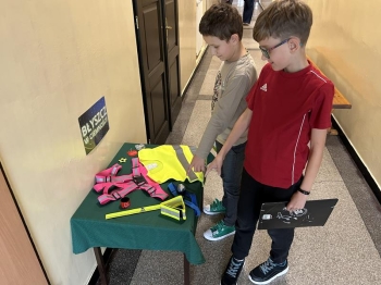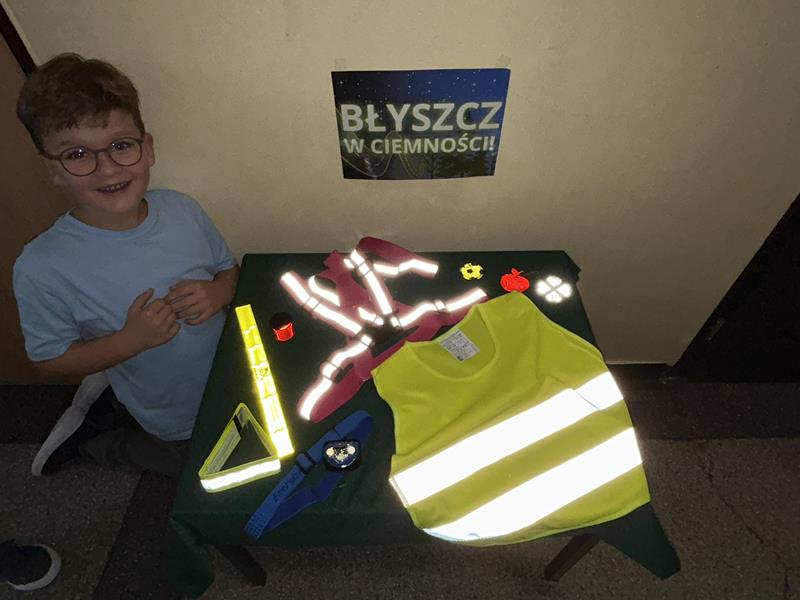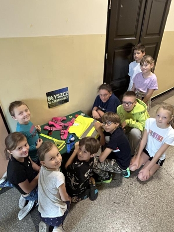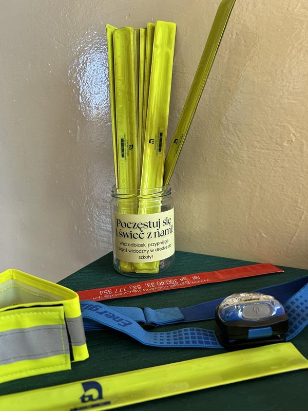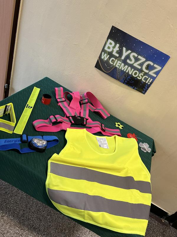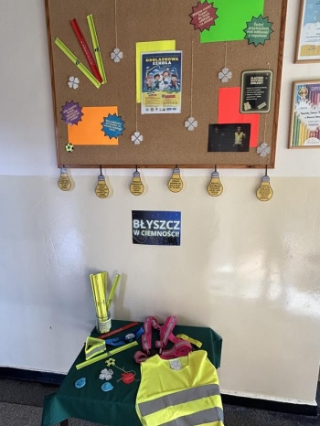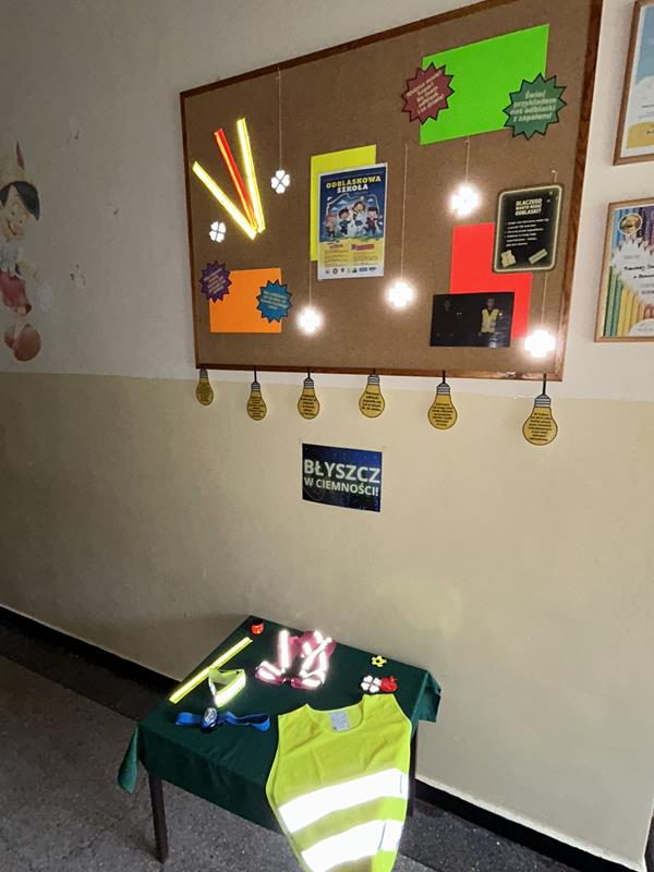 Jako podsumowanie spotkania przygotowano na szkolnym korytarzu barwną gazetkę pod hasłem „Błyszcz w ciemności". Znalazły się na niej najważniejsze informacje dotyczące noszenia odblasków, a także przykłady różnych ich rodzajów – zawieszek, opasek, breloków czy naklejek. Każdy, kto odwiedza gazetkę, może również zabrać ze sobą wybrany odblask.
