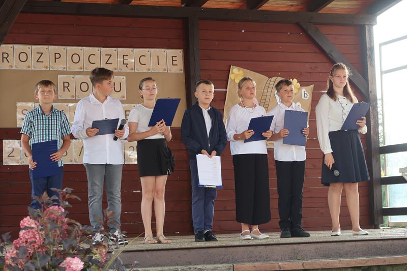 1 września 2025 roku uroczyście rozpoczęliśmy nowy rok szkolny 2025/2026. Na szkolnym boisku zebrali się uczniowie, nauczyciele, rodzice oraz zaproszeni goście. Pani Dyrektor serdecznie powitała całą społeczność szkolną. Uczniowie klasy V wraz z panią Pauliną Giemza przygotowali program artystyczny, który nawiązywał do wspomnień z wakacji. Występ wzbogacony był o wiersze znanych polskich poetów na tle aranżacji muzycznych oraz o fragment fraszki Jana Kochanowskiego ,,Na lipę” w aranżacji inspirowanej muzyką etniczną.