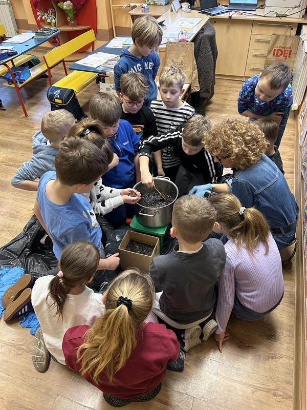 Najpierw uczniowie mieszali smalec ze słonecznikiem i kukurydzą, a następnie starannie nakładali gotową masę do pojemniczków. Było przy tym dużo radości, uśmiechu i zaangażowania małych rąk. Gdy kule były gotowe, zostały zawieszone na placu szkolnym.